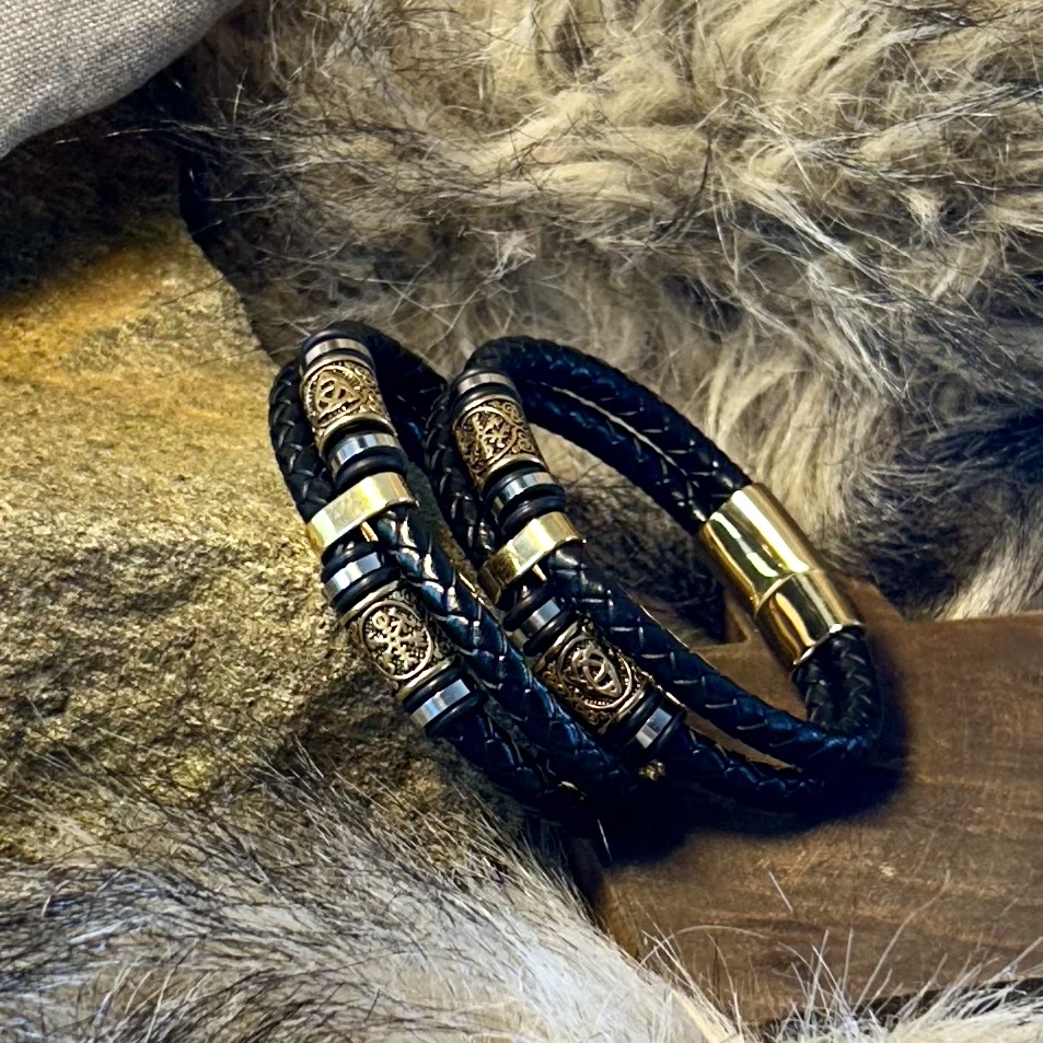 Ett armband som kombinerar tidlös design med robust material – perfekt för dig som vill bära något som både känns och håller. Detta populära armband är handgjort i kraftigt läder och pryds av detaljer i rostfritt stål, med stilrena berlocker av vegvisir och triskelion som ger en rå men elegant känsla. En diskret accessoar med attityd – lika rätt till vardags som till fest.