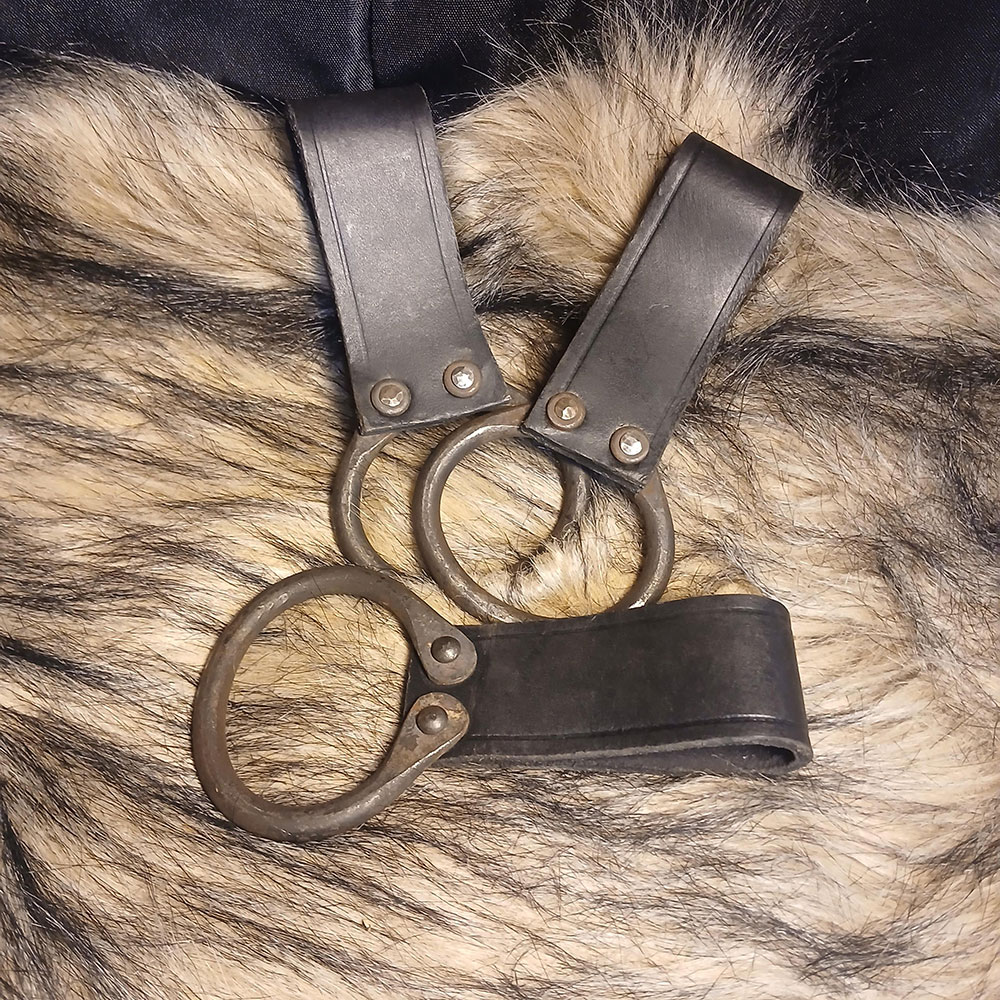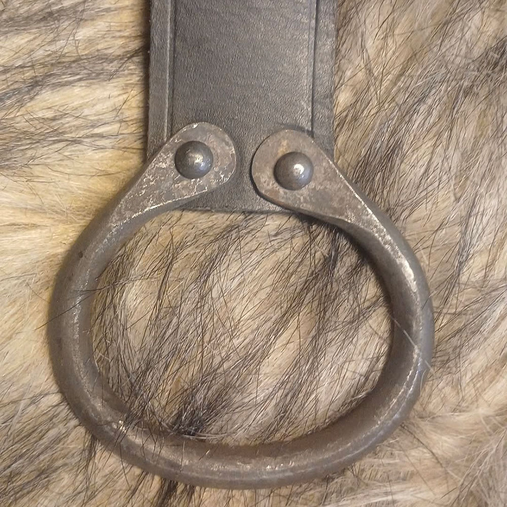 Denna bälteshållare är tillverkad i stabilt läder och utrustad med en handsmidd ring som håller yxan stadigt på plats. Den robusta konstruktionen gör den både praktisk och slitstark, samtidigt som den ger ett rustikt och autentiskt intryck. Ett självklart tillbehör för lajv, reenactment eller historiska miljöer där funktion och känsla går hand i hand.