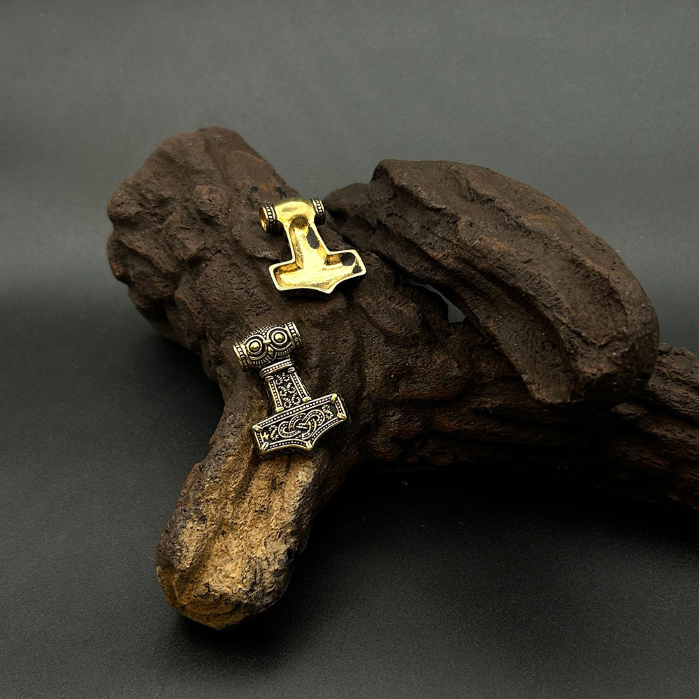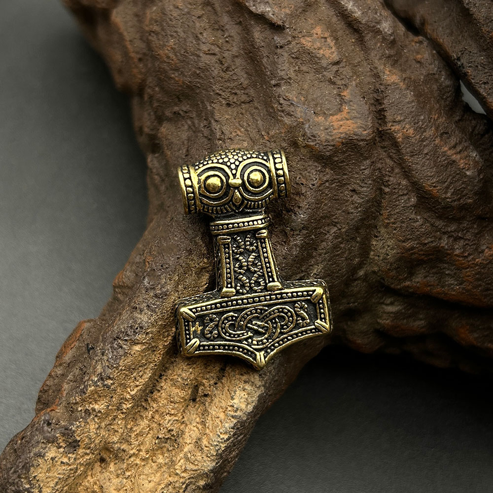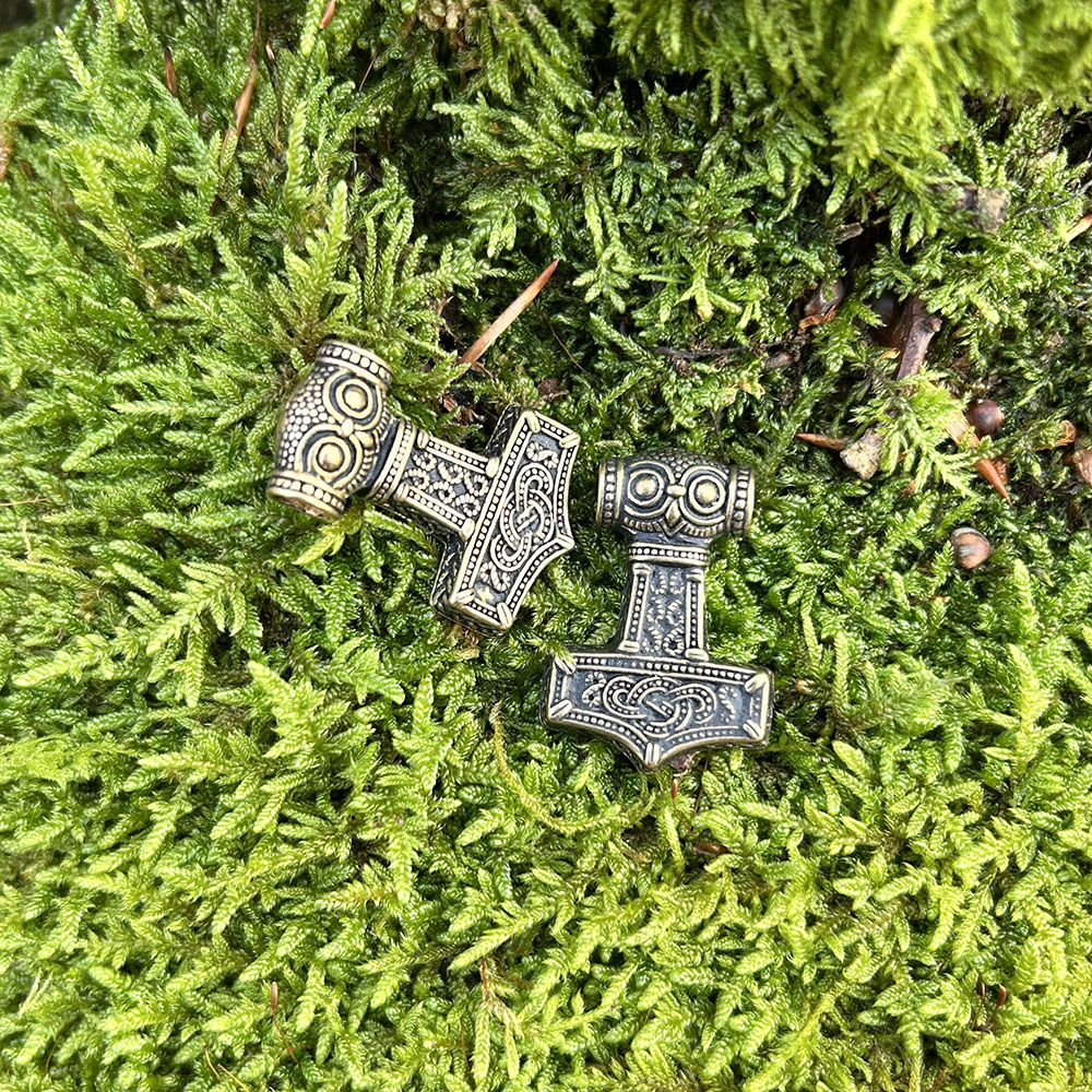 En detaljrik och mindre Torshammare inspirerad av ett av de mest särpräglade vikingatida fynden – hammaren från Rømersdal i Ödeshög, Östergötland. Originalet dateras till 900-talet och förvaras idag på Danmarks nationalmuseum. Till skillnad från många andra enklare torshammare bär denna en utsmyckning som drar blickarna till sig – med filigranliknande mönster och ett unikt uggleliknande övre parti, komplett med ögon och näbb. Replikan är gjuten i ett enda stycke, men återger skickligt den historiska känslan. Trots sin mindre storlek rymmer den samma tyngd av symbolik – skydd, styrka och trofasthet.