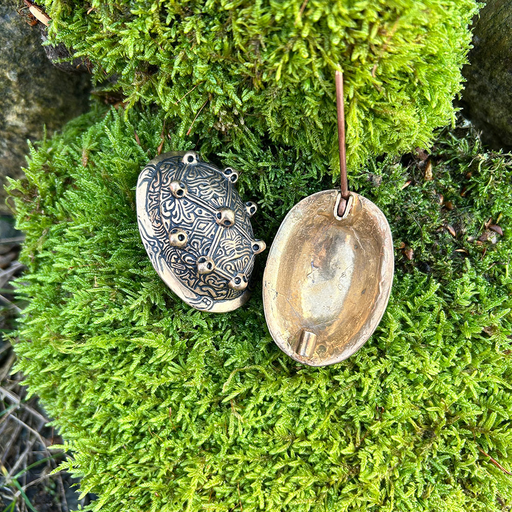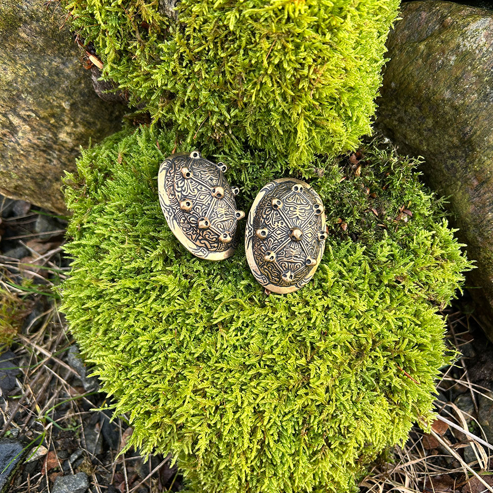 Dessa vackert tillverkade spännbucklor är trogna reproduktioner av ett vikingatida fynd från Saltvik på Åland. Ett smycke som bars av kvinnorna i norr, både som prydnad och praktiskt fäste för klänningens axelband. Skålbroscher – även kallade sköldpaddsbroscher eller puckelbroscher – var en självklar del av kvinnans dräkt och vittnade om status, ursprung och tillhörighet. Våra bucklor är detaljrika, exakt tillverkade i kraftig brons, precis som originalen.