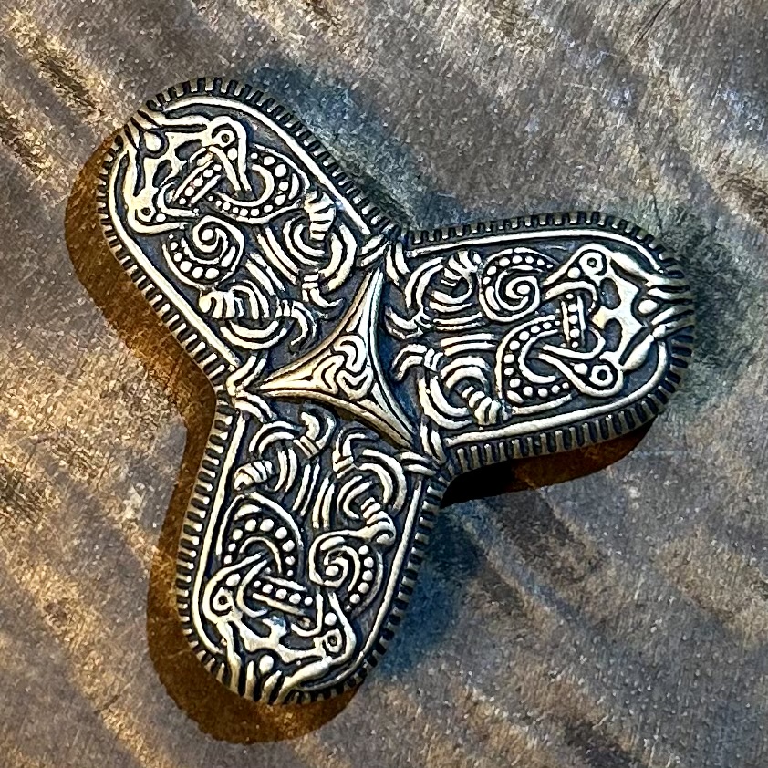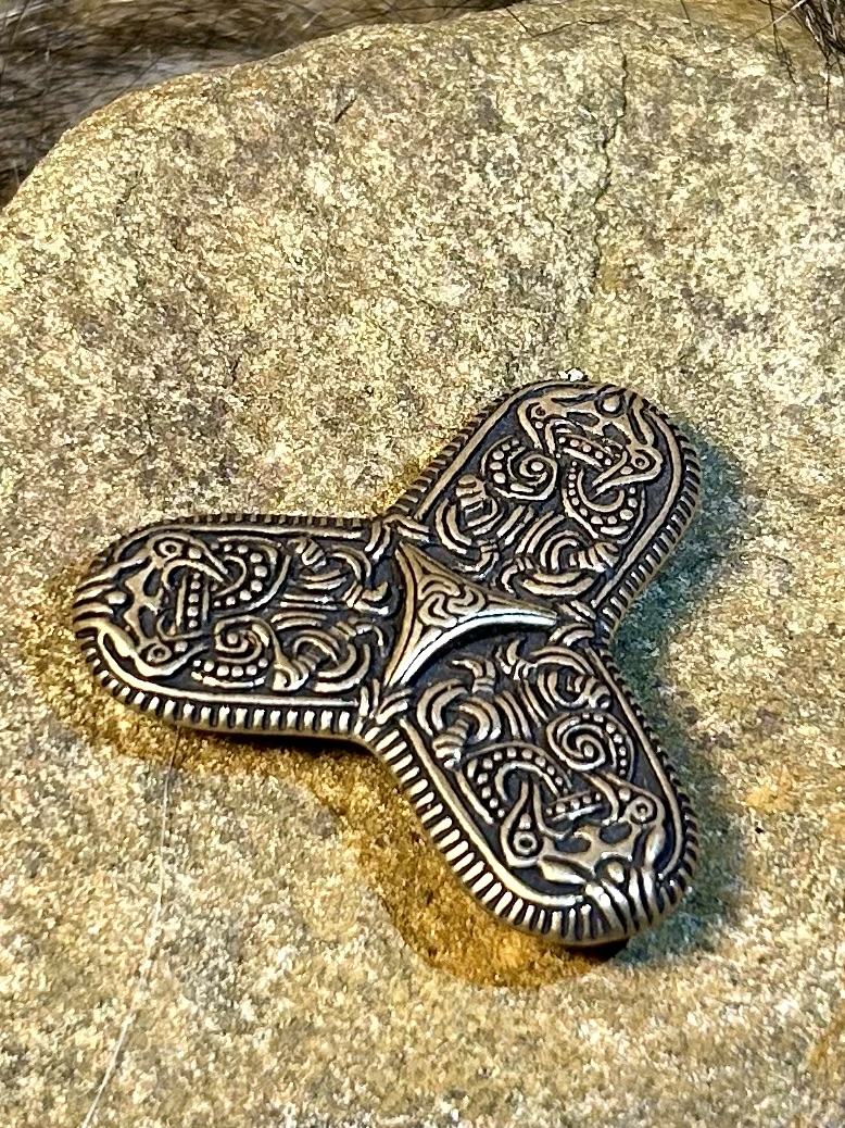 En vacker vikingabrosch i klöverbladsform, som är en replika av ett dräktlås som hittades i Tranby i Norrland. Originalet är ca 3 cm större, men replikan har inte förlorat sin charm. Stilmässigt kan denna brosch från 900-talet klassificeras mellan Borre- och Jelling-stilarna.